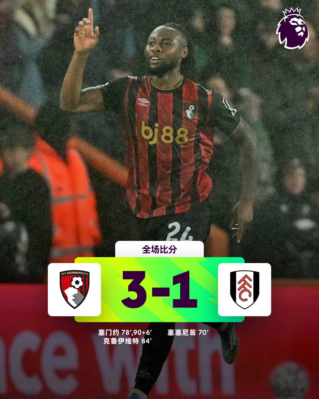 第78分钟,伯恩茅斯扳平比分!塞门约在左侧强行带球过人,突入禁区,小角度低射,皮球从门将裆下穿过去,钻入球门!这粒进球完全是依靠个人能力!6分钟后,伯恩茅斯再进一球!克鲁伊维特轰出一脚无解世界波!伯恩茅斯反超比分!第96分钟,伯恩茅斯又进球了!依然是塞门约,他在禁区内包抄推射打进,杀死比赛!最终的比分定格为3-1,伯恩茅斯逆转击败富勒姆!
